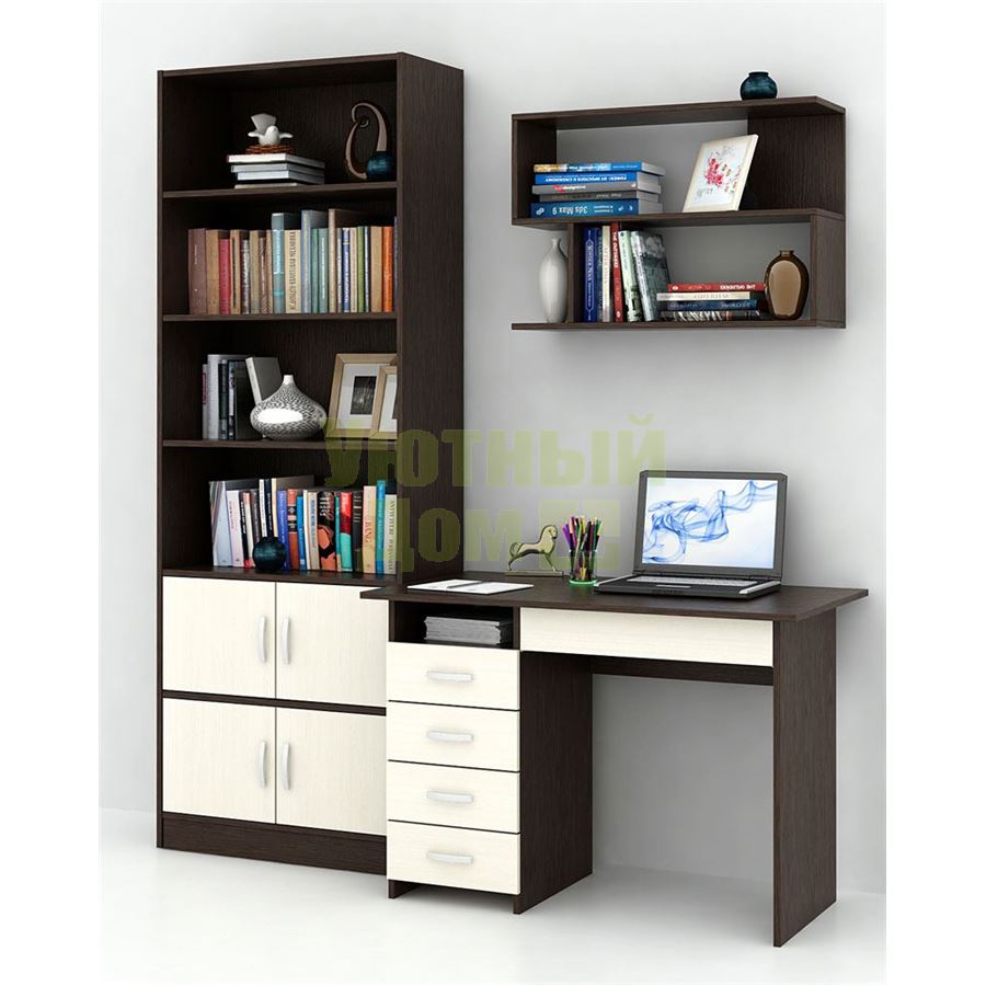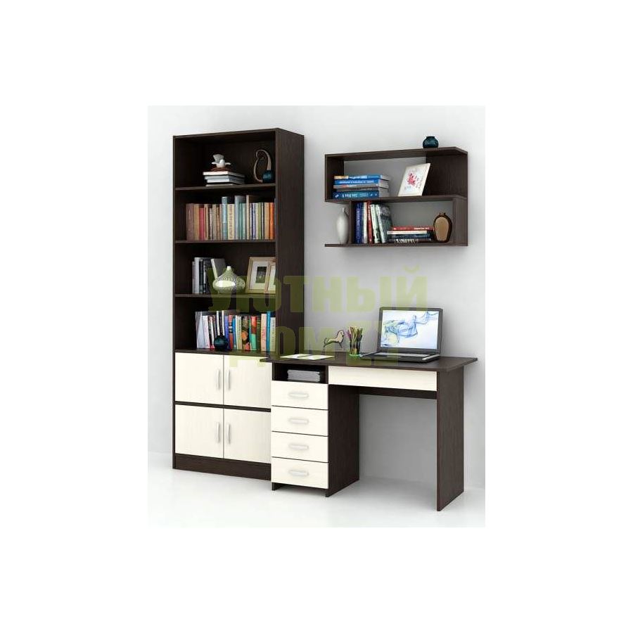 Каждый элемент возможно приобрести по отдельности. Состав комплекта: стол Милан-1 (1 шт.), полка Файн-13 (1 шт.), стеллаж Либерти-5 (1 шт.), дверка для стеллажей Либерти (1 шт.).