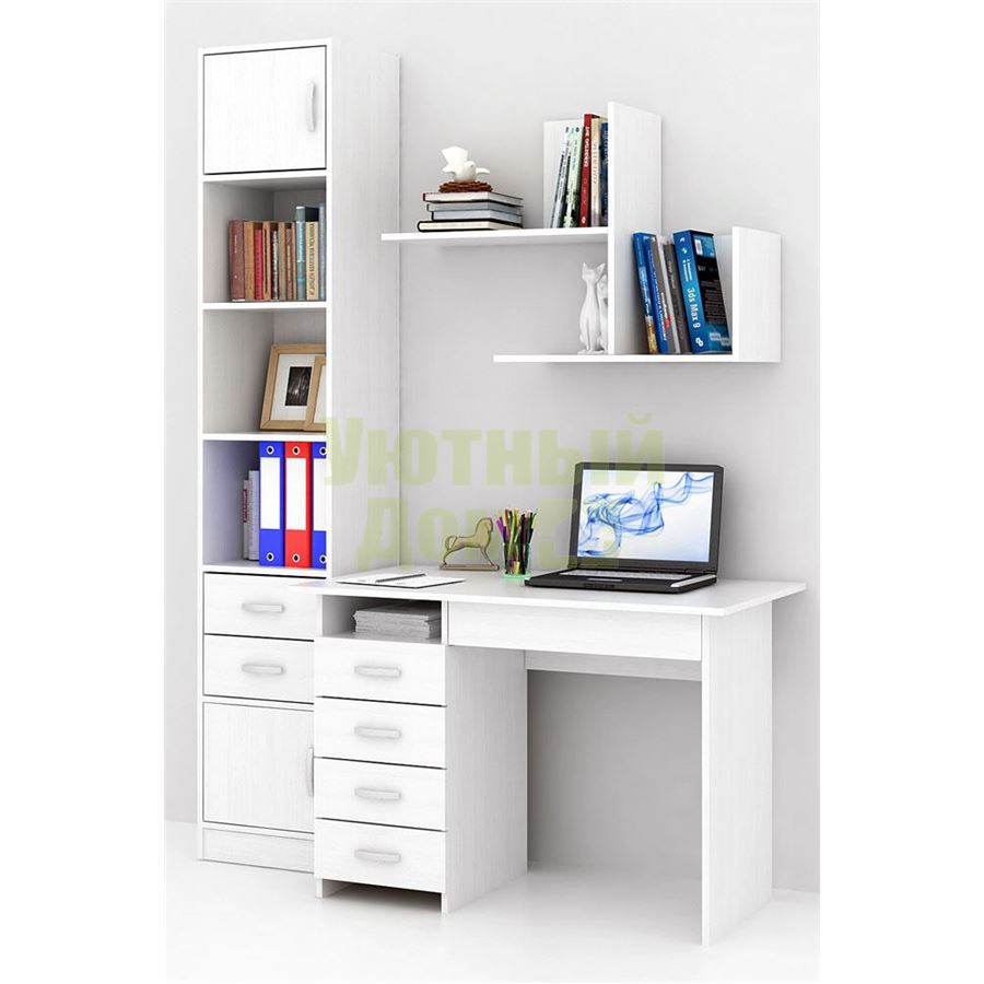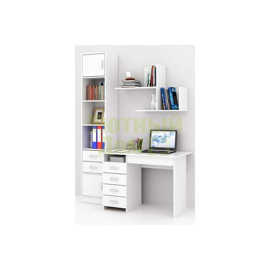 Каждый элемент возможно приобрести по отдельности. Состав комплекта: стол Милан-1 (1 шт.), стеллаж Либерти-4 (1 шт.), Блок ящиков Либерти малый (1 шт.), дверка для стеллажей Либерти (2 шт.), полка Файн-17 (1 шт.).