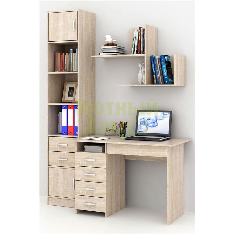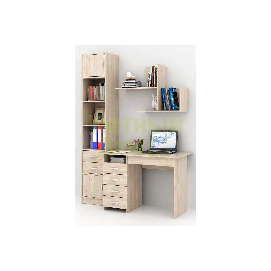 Каждый элемент возможно приобрести по отдельности. Состав комплекта: стол Милан-1 (1 шт.), стеллаж Либерти-4 (1 шт.), Блок ящиков Либерти малый (1 шт.), дверка для стеллажей Либерти (2 шт.), полка Файн-17 (1 шт.).