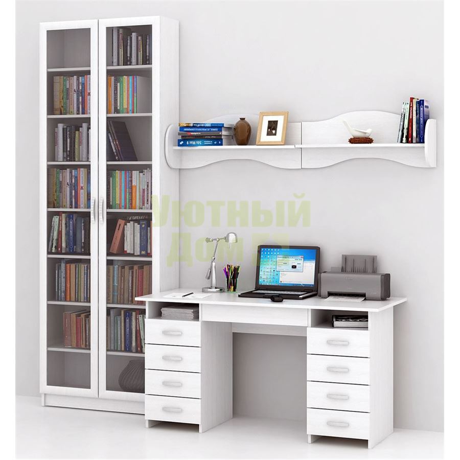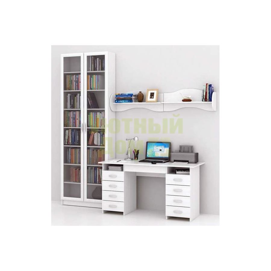 Каждый элемент возможно приобрести по отдельности. Состав комплекта: стол Милан-10Я (1 шт.), полка Тэя-1 (2 шт.), стеллаж Милан-46 (1 шт.).