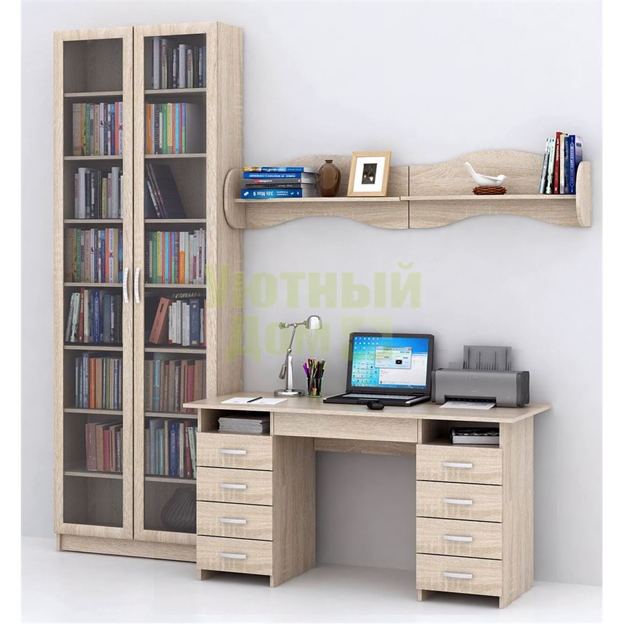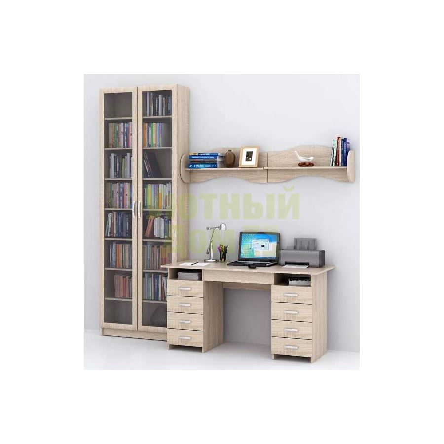 Каждый элемент возможно приобрести по отдельности. Состав комплекта: стол Милан-10Я (1 шт.), полка Тэя-1 (2 шт.), стеллаж Милан-46 (1 шт.).