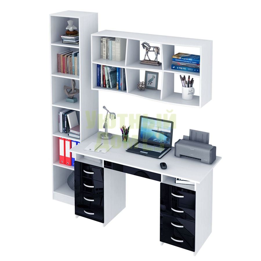 Каждый элемент возможно приобрести по отдельности. Состав комплекта: стол Милан-10Я Глянец (1 шт.), полка Вэйв-9 (1 шт.), стеллаж Либерти-4 (1 шт.).