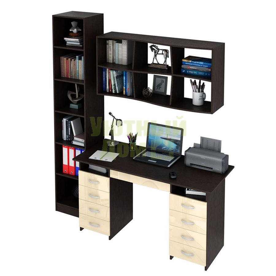 Каждый элемент возможно приобрести по отдельности. Состав комплекта: стол Милан-10Я Глянец (1 шт.), полка Вэйв-9 (1 шт.), стеллаж Либерти-4 (1 шт.).