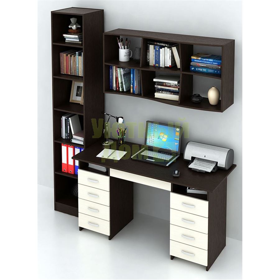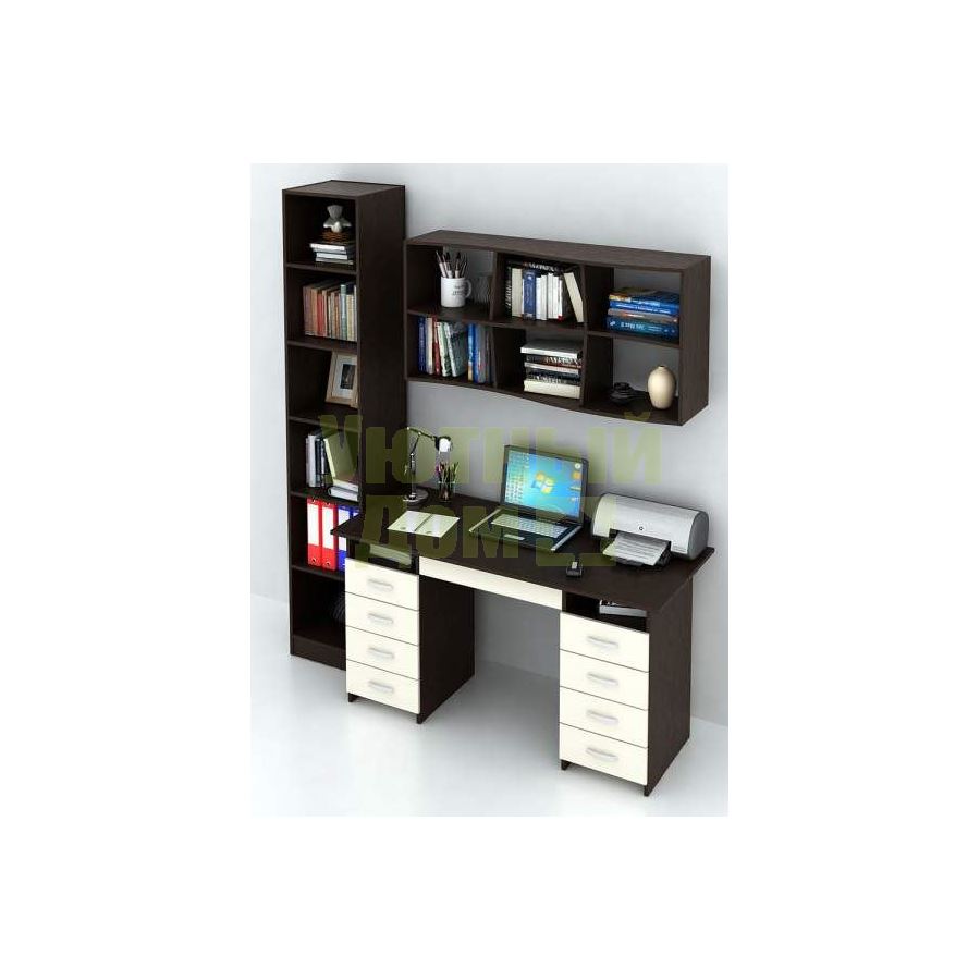 Каждый элемент возможно приобрести по отдельности. Состав комплекта: стол Милан-10Я (1 шт.), полка Вэйв-9 (1 шт.), стеллаж Либерти-4 (1 шт.).