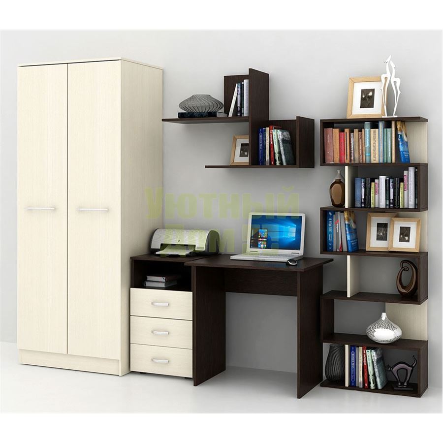 Каждый элемент возможно приобрести по отдельности. Состав комплекта: стол Милан-2 (1 шт.), шкаф Ланс-1 (1 шт.), стеллаж Файн-1 (1 шт.), полка Файн-17 (1 шт.), тумба Альба-4 (1 шт.).