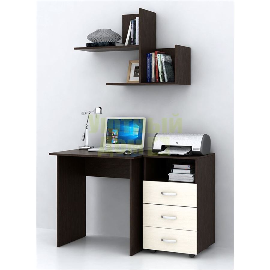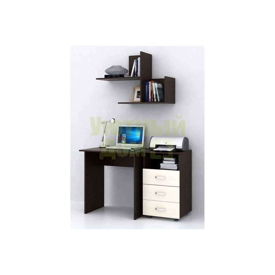 Каждый элемент возможно приобрести по отдельности. Состав комплекта: стол Милан-2 (1 шт.), полка Файн-17 (1 шт.), тумба Альба-4 (1 шт.).