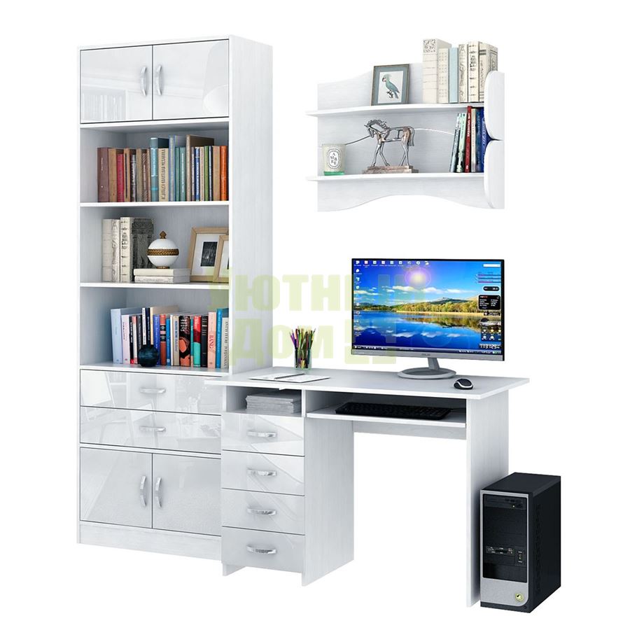 Каждый элемент возможно приобрести по отдельности. Состав комплекта: стол Милан-3 Глянец (1 шт.), полка Тэя-1 (2 шт.), стеллаж Либерти-5 (1 шт.), блок ящиков Либерти большой Глянец (1 шт.), дверка для стеллажей Либерти Глянец (4 шт.).