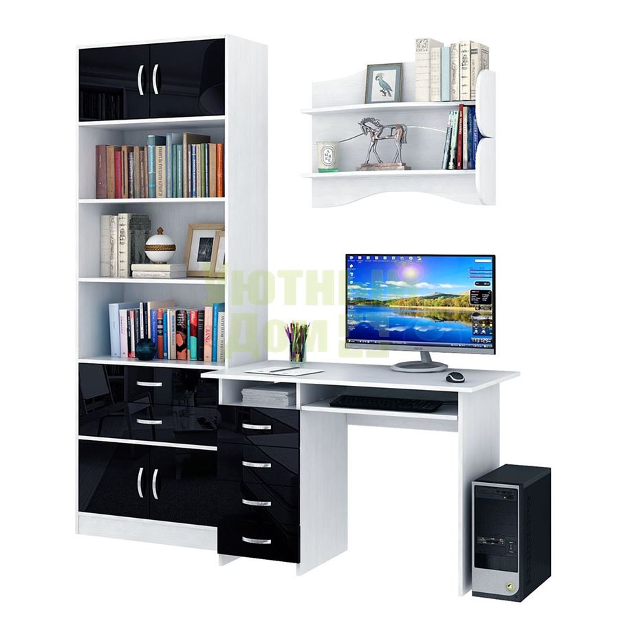 Каждый элемент возможно приобрести по отдельности. Состав комплекта: стол Милан-3 Глянец (1 шт.), полка Тэя-1 (2 шт.), стеллаж Либерти-5 (1 шт.), блок ящиков Либерти большой Глянец (1 шт.), дверка для стеллажей Либерти Глянец (4 шт.).
