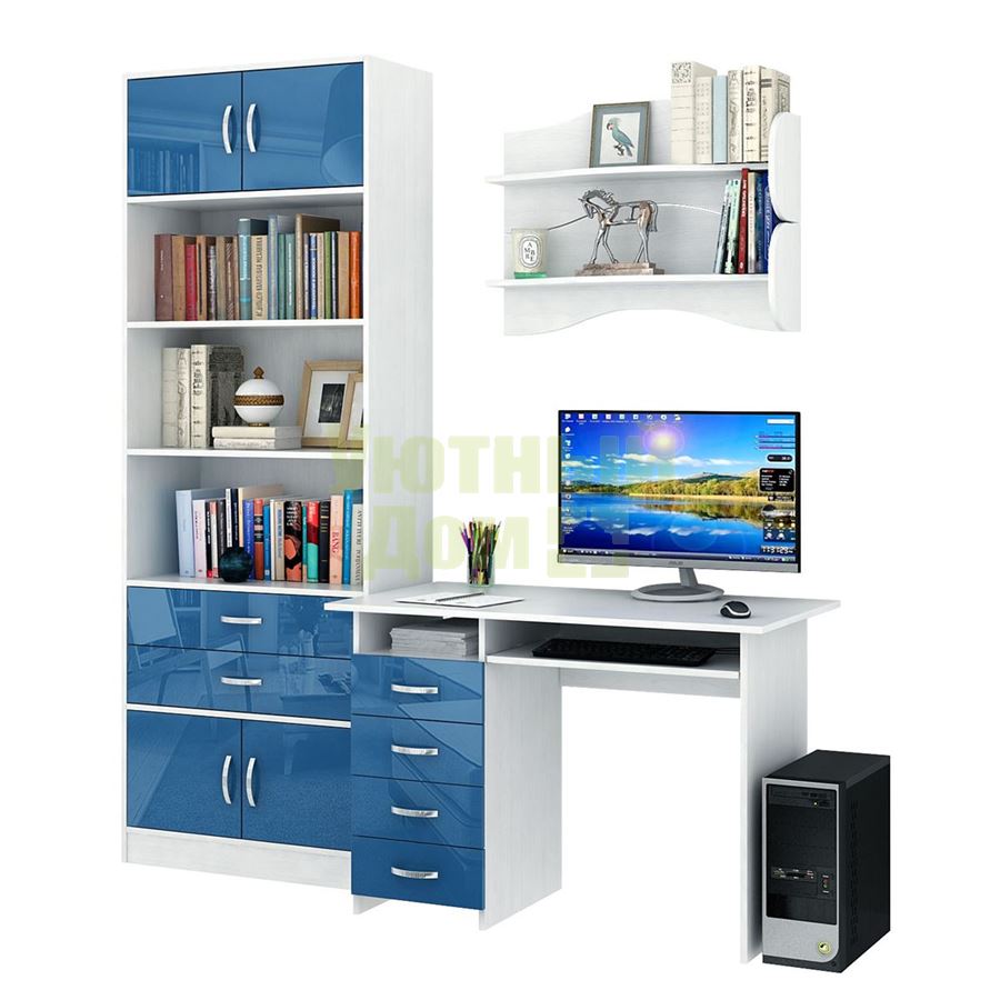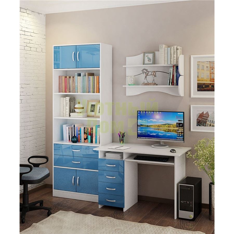 Каждый элемент возможно приобрести по отдельности. Состав комплекта: стол Милан-3 Глянец (1 шт.), полка Тэя-1 (2 шт.), стеллаж Либерти-5 (1 шт.), блок ящиков Либерти большой Глянец (1 шт.), дверка для стеллажей Либерти Глянец (4 шт.).