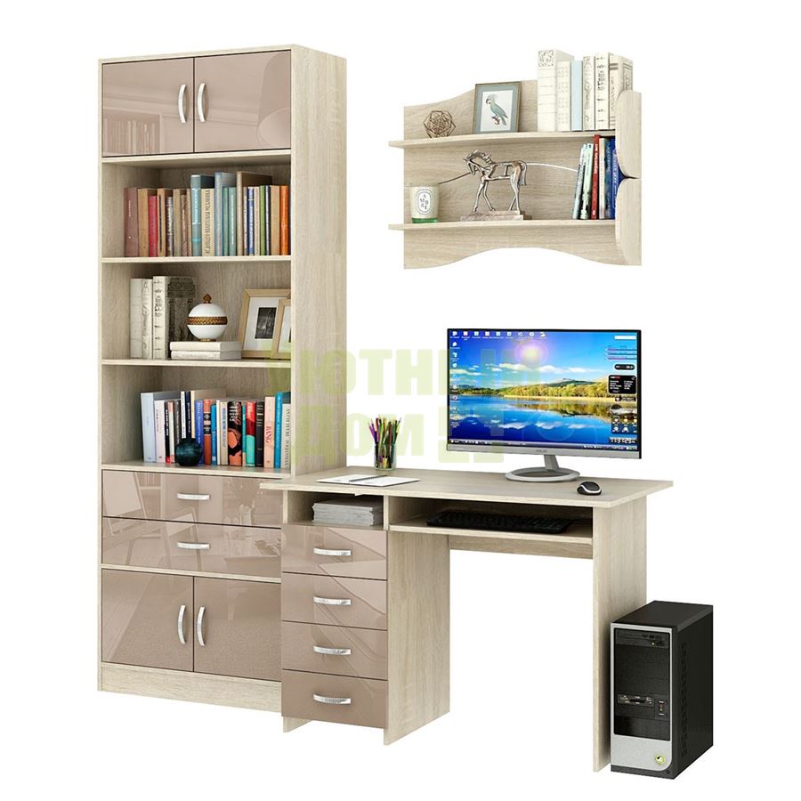 Каждый элемент возможно приобрести по отдельности. Состав комплекта: стол Милан-3 Глянец (1 шт.), полка Тэя-1 (2 шт.), стеллаж Либерти-5 (1 шт.), блок ящиков Либерти большой Глянец (1 шт.), дверка для стеллажей Либерти Глянец (4 шт.).