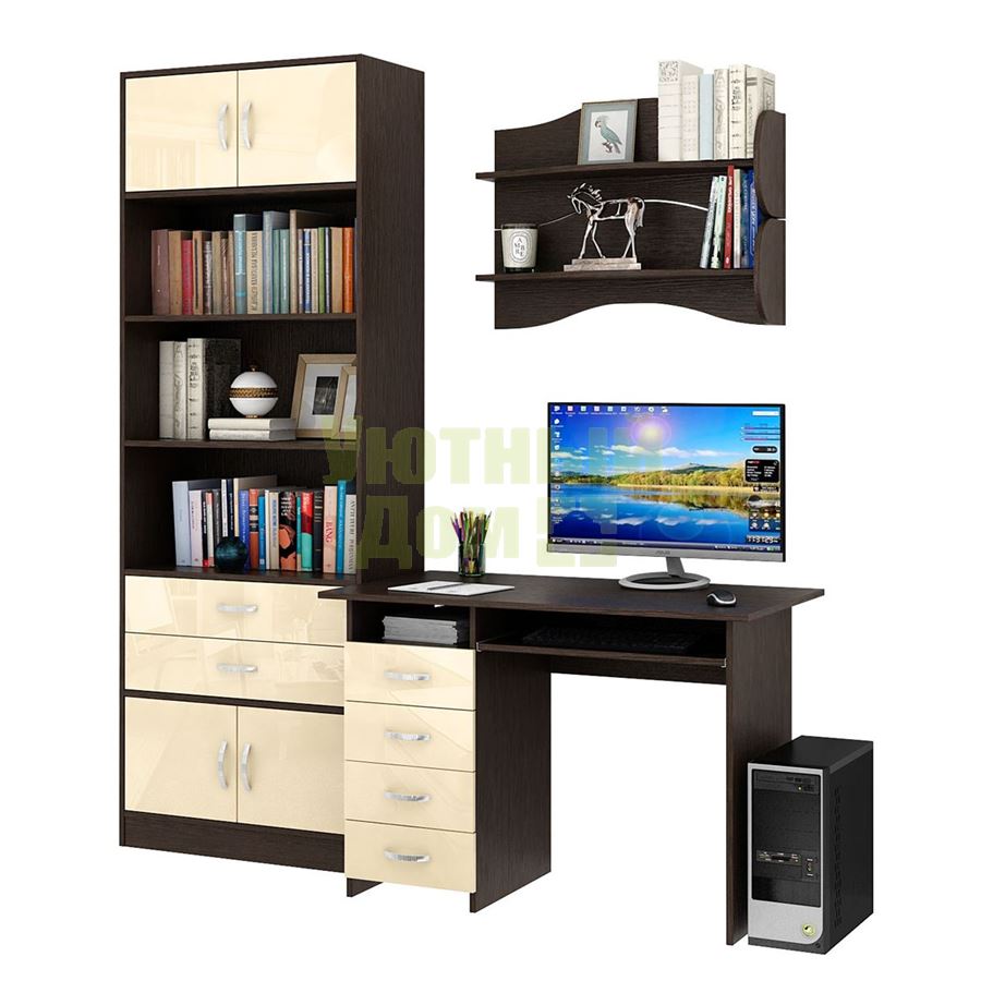 Каждый элемент возможно приобрести по отдельности. Состав комплекта: стол Милан-3 Глянец (1 шт.), полка Тэя-1 (2 шт.), стеллаж Либерти-5 (1 шт.), блок ящиков Либерти большой Глянец (1 шт.), дверка для стеллажей Либерти Глянец (4 шт.).