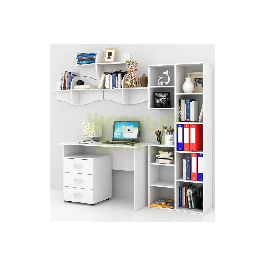 Каждый элемент возможно приобрести по отдельности. Состав комплекта: стол Милан-5 (1 шт.), стеллаж Рикс-2 (1 шт.), тумба Альба-3 (1 шт.), полка Тэя-3 (3 шт.).