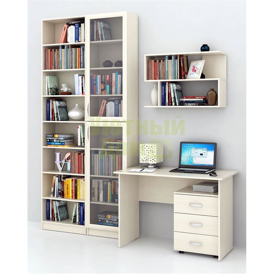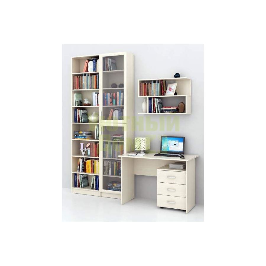 Каждый элемент возможно приобрести по отдельности. Состав комплекта: стол Милан-5 (1 шт.), стеллажи Милан-47 (1 шт.), Милан-33 (1 шт.), полка Файн-13 (1 шт.), тумба Альба-3 (1 шт.).