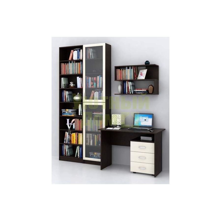 Каждый элемент возможно приобрести по отдельности. Состав комплекта: стол Милан-5 (1 шт.), стеллажи Милан-47 (1 шт.), Милан-33 (1 шт.), полка Файн-13 (1 шт.), тумба Альба-3 (1 шт.).