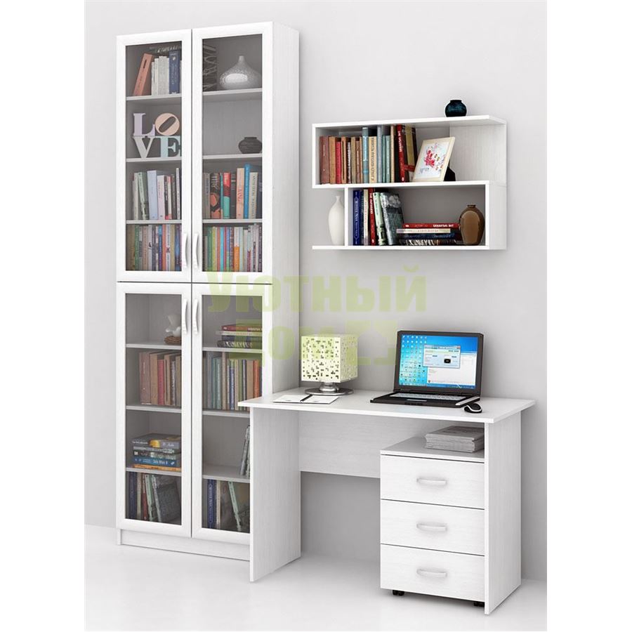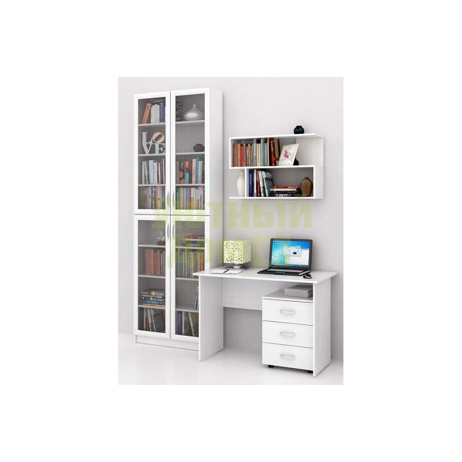 Каждый элемент возможно приобрести по отдельности. Состав комплекта: стол Милан-5 (1 шт.), Стеллаж Милан-36 (1 шт.), полка Файн-13 (1 шт.), тумба Альба-3 (1 шт.).