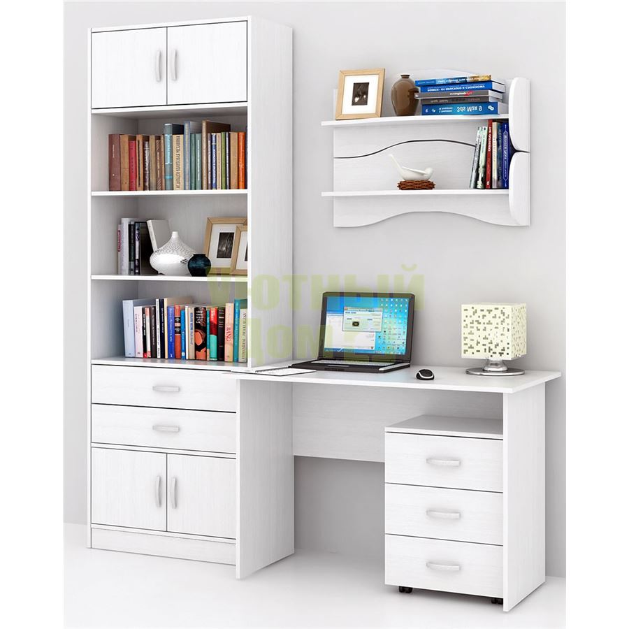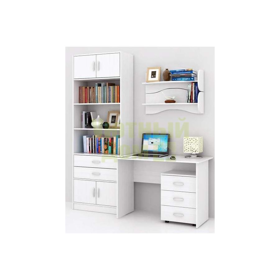 Каждый элемент возможно приобрести по отдельности. Состав комплекта: стол Милан-5 (1 шт.), полка Тэя-1 (2 шт.), стеллаж Либерти-5 (1 шт.), блок ящиков Либерти большой (1 шт.), дверка для стеллажей Либерти (4 шт.), тумба Альба-3 (1 шт.).