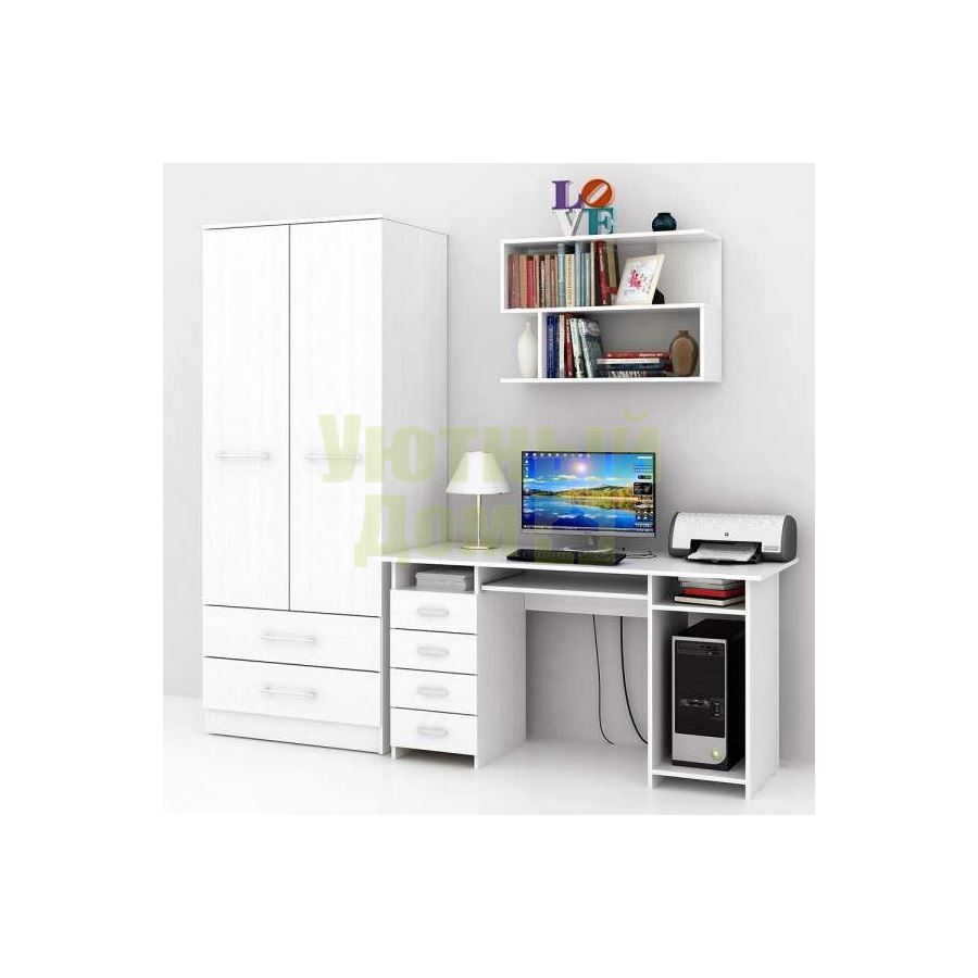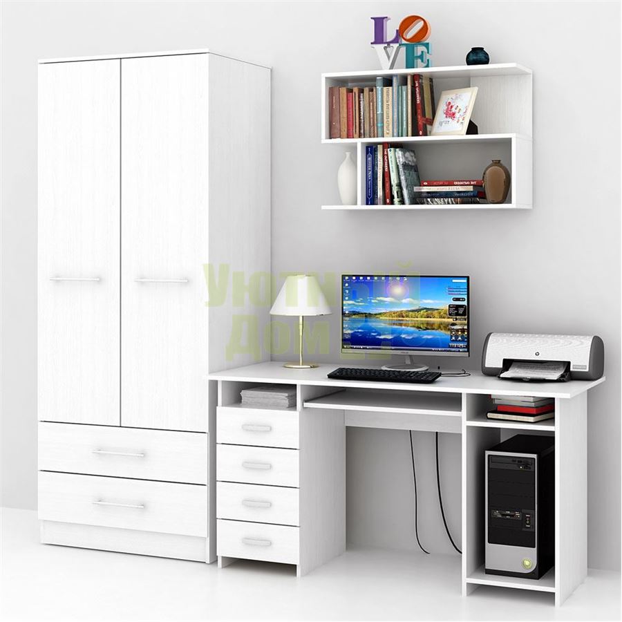 Каждый элемент возможно приобрести по отдельности. Состав комплекта: стол Милан-6П (1 шт.), шкаф Ланс-2 (1 шт.), полка Файн-13 (1 шт.).