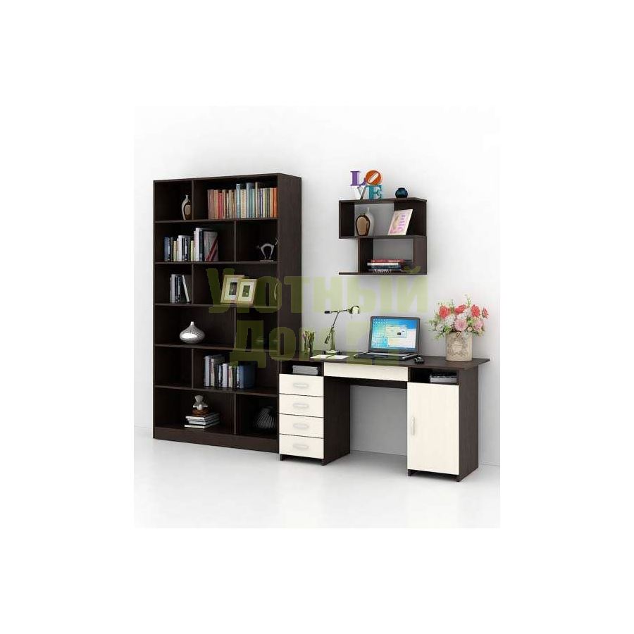Каждый элемент возможно приобрести по отдельности. Состав комплекта: стол Милан-7Я (1 шт.), стеллаж Либерти-6 (1 шт.), полка Файн-12 (1 шт.).