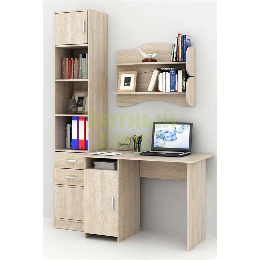 Каждый элемент возможно приобрести по отдельности. Состав комплекта: стол Милан-8 (1 шт.), полка Тэя-1 (2 шт.), стеллаж Либерти-4 (1 шт.), блок ящиков Либерти малый (1 шт.), дверка для стеллажей Либерти (2 шт.).