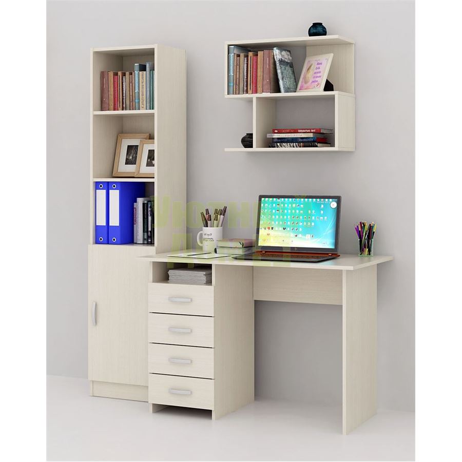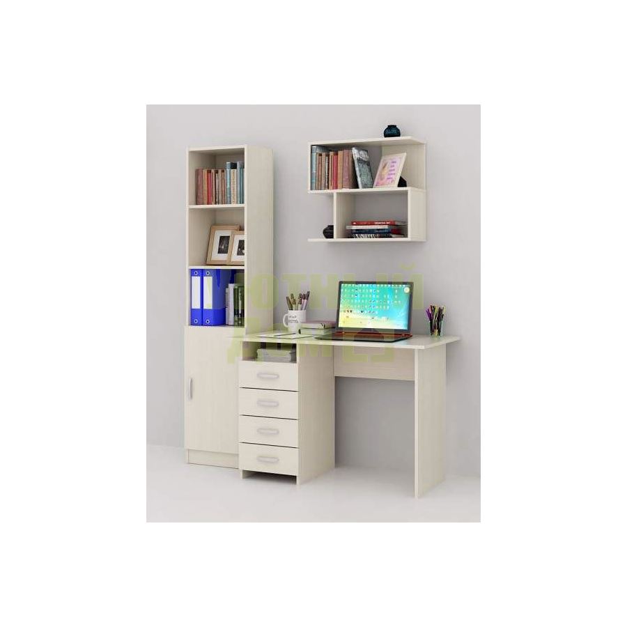 Каждый элемент возможно приобрести по отдельности. Состав комплекта: стол Милан (1 шт.), стеллаж Авант-1 (1 шт.), полка Файн-12 (1 шт.).