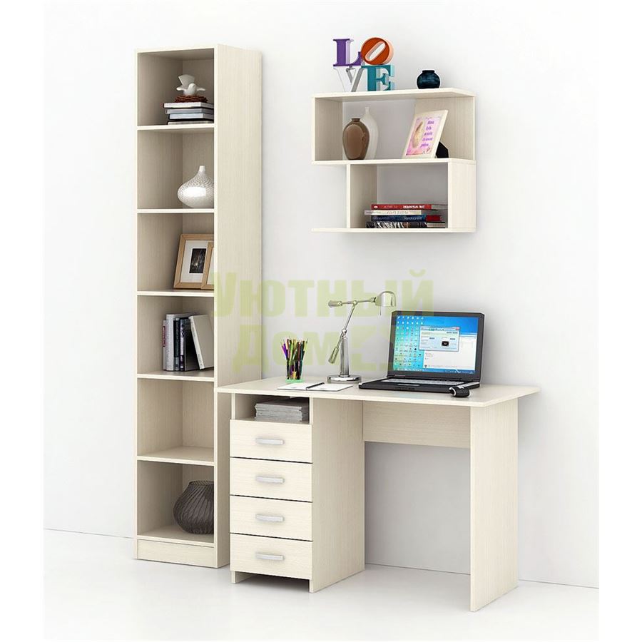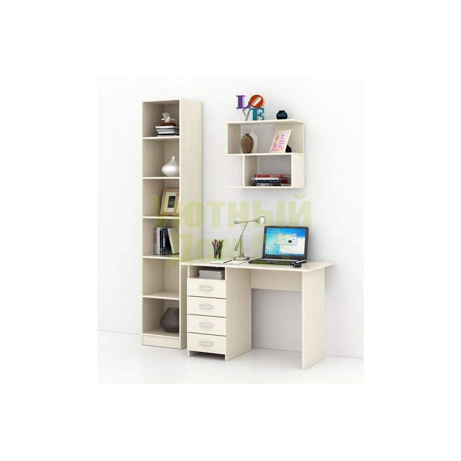 Каждый элемент возможно приобрести по отдельности. Состав комплекта: стол Милан (1 шт.), стеллаж Либерти-4 (1 шт.), полка Файн-12 (1 шт.).