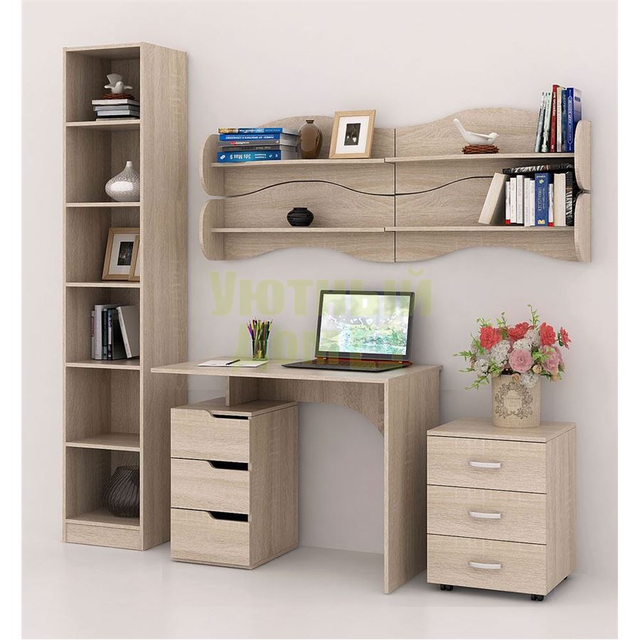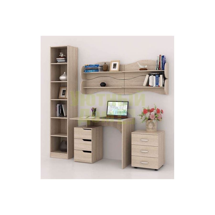 Каждый элемент возможно приобрести по отдельности. Состав комплекта: стол Нейт-1 (1 шт.), стеллаж Либерти-4 (1 шт.), полка Тэя-1 (4 шт.), тумба Альба-3 (1 шт.). Декоративные заглушки в тон мебели для скрытия технологических отверстий. Сборку данного товара желательно осуществлять вдвоем во избежание травмоопасных ситуаций или механических повреждений мебели.
