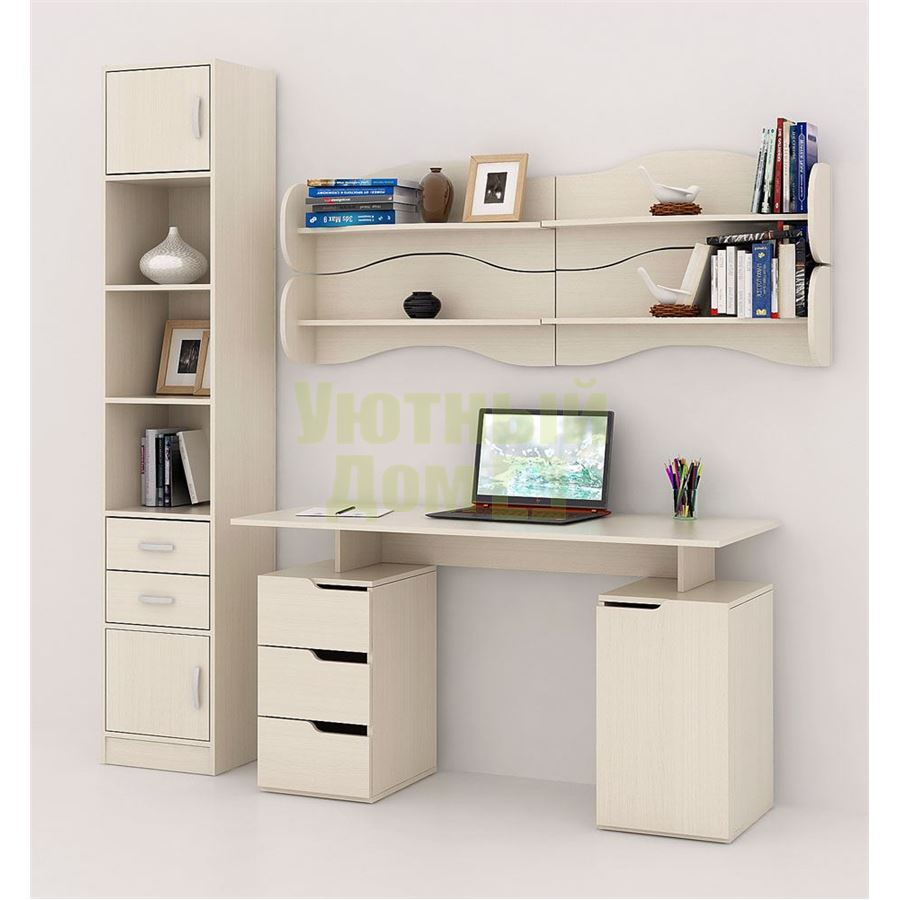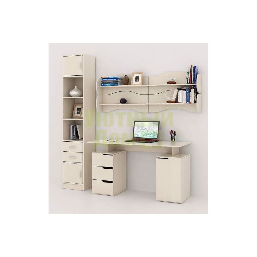 Каждый элемент возможно приобрести по отдельности. Состав комплекта: стол Нейт-3 (1 шт.), стеллаж Либерти-4 (1 шт.), блок ящиков Либерти малый (1 шт.), дверка для стеллажей Либерти (2 шт.), полка Тэя-1 (4 шт.).