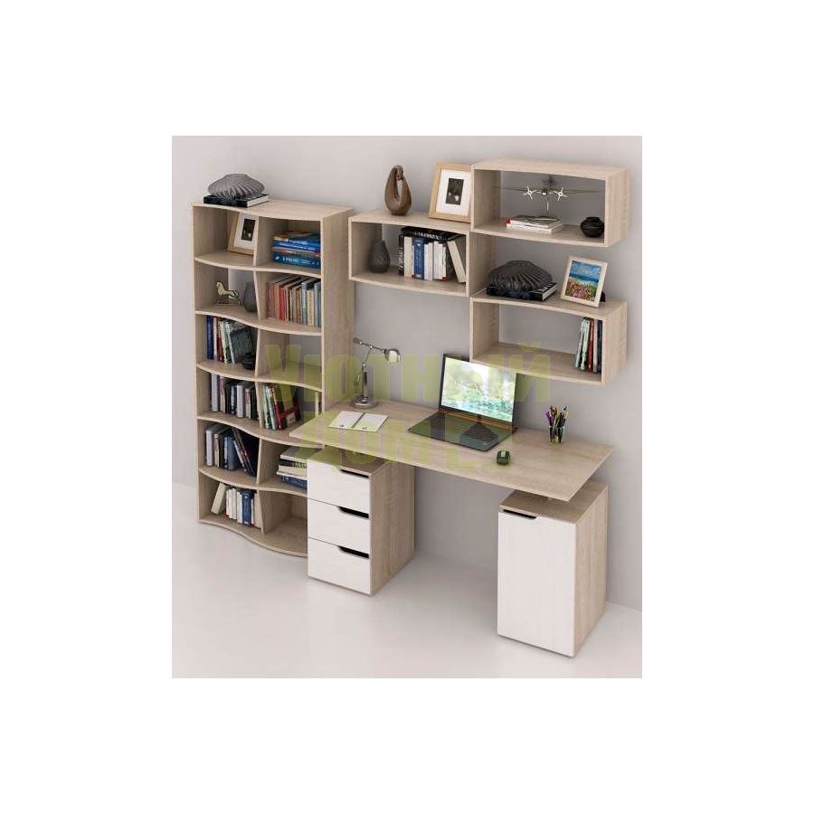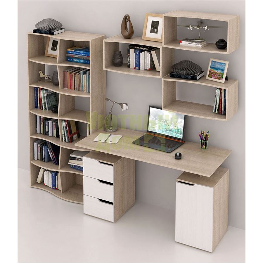 Каждый элемент возможно приобрести по отдельности. Состав комплекта: стол Нейт-3 (1 шт.), стеллаж Вэйв-(1 шт.), полка Вэйв-7 (1 шт.).