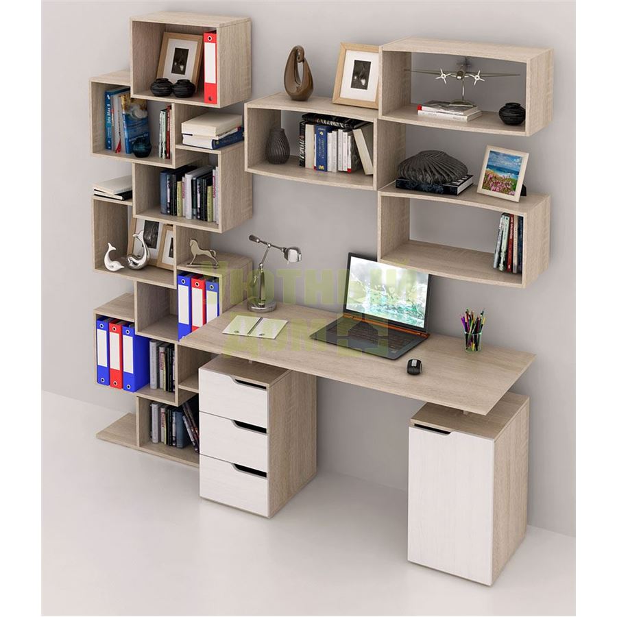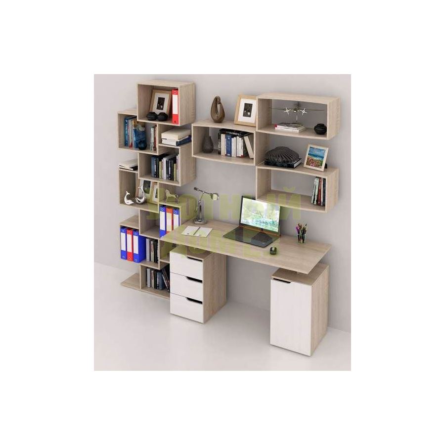 Каждый элемент возможно приобрести по отдельности. Состав комплекта: стол Нейт-3 (1 шт.), стеллаж Зет-4 (1 шт.), полка Вэйв-7 (1 шт.).