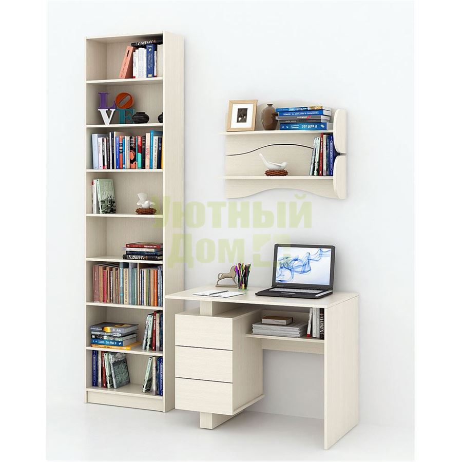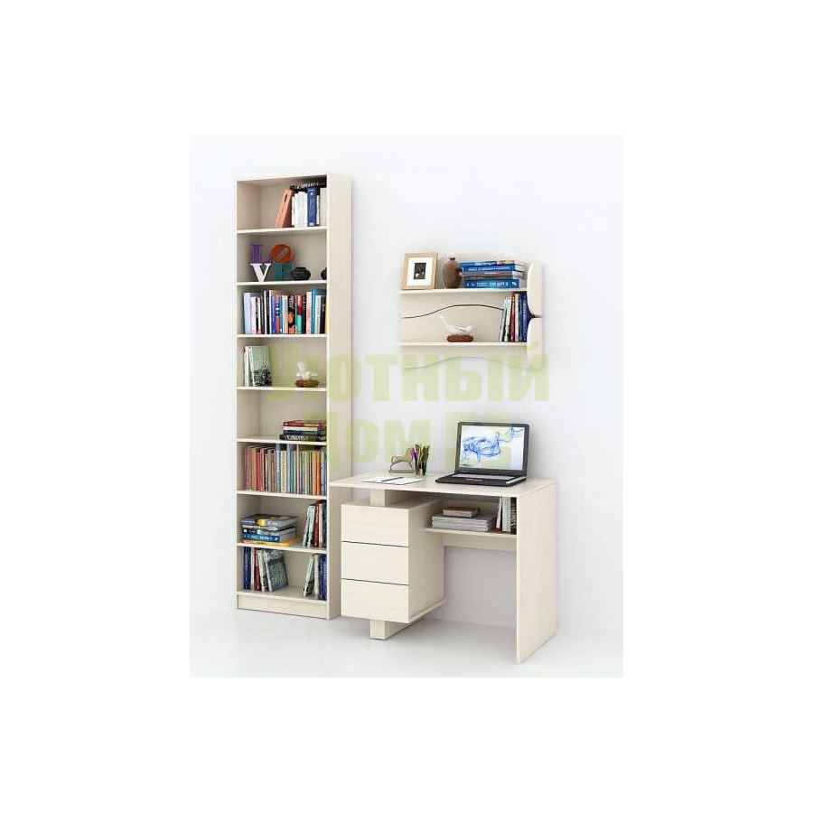 Каждый элемент возможно приобрести по отдельности. Состав комплекта: стол Ренцо-1 (1 шт.), стеллаж Милан-33 (1 шт.), полка Тэя-1 (2 шт.).