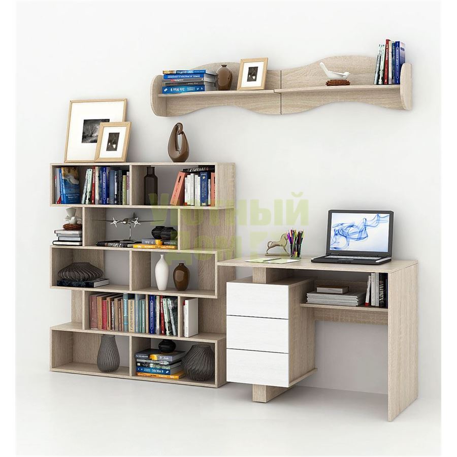 Каждый элемент возможно приобрести по отдельности. Состав комплекта: стол Ренцо-1 (1 шт.), стеллаж Грас-1 (1 шт.), полка Тэя-1 (2 шт.). Декоративные заглушки в тон мебели для скрытия технологических отверстий. Сборку данного товара желательно осуществлять вдвоем во избежание травмоопасных ситуаций или механических повреждений мебели.