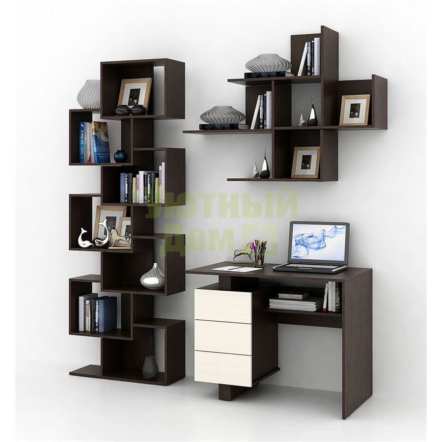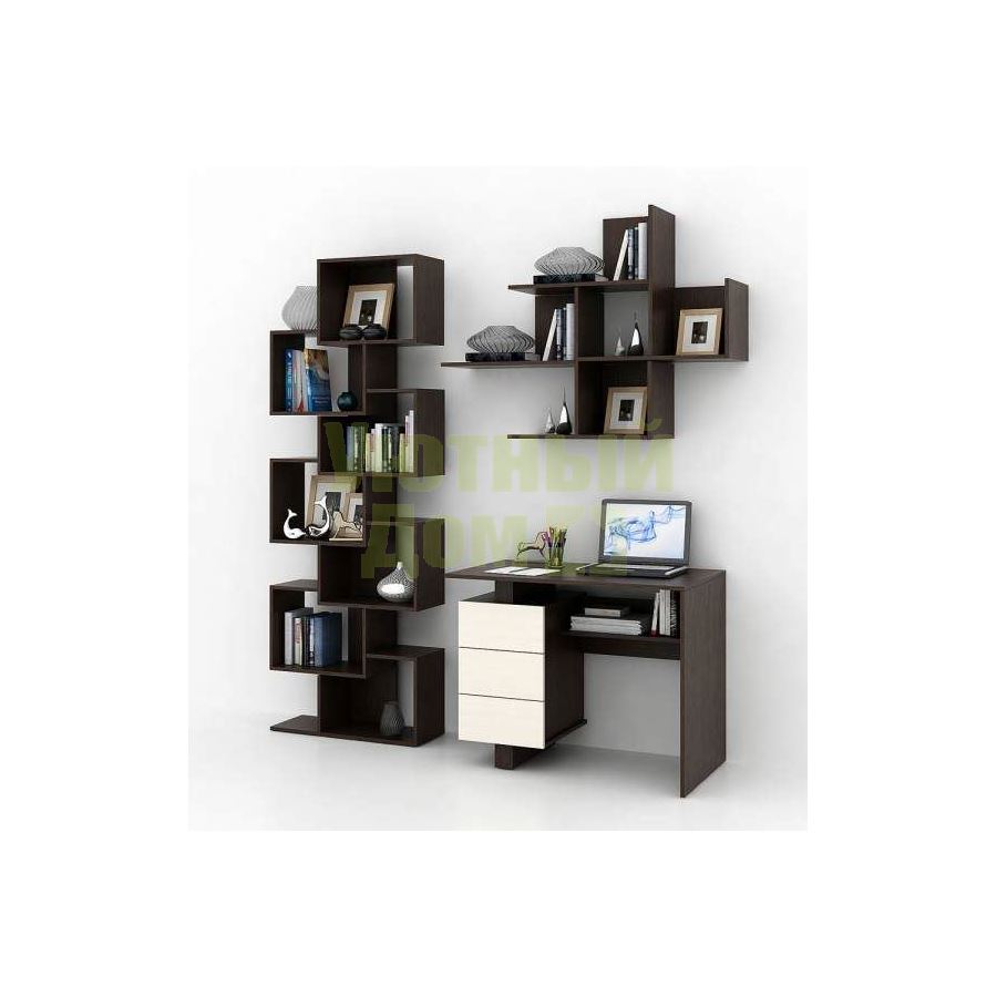 Каждый элемент возможно приобрести по отдельности. Состав комплекта: стол Ренцо-1 (1 шт.), стеллаж Зет-4 (1 шт.), полка Файн-17 (2 шт.).