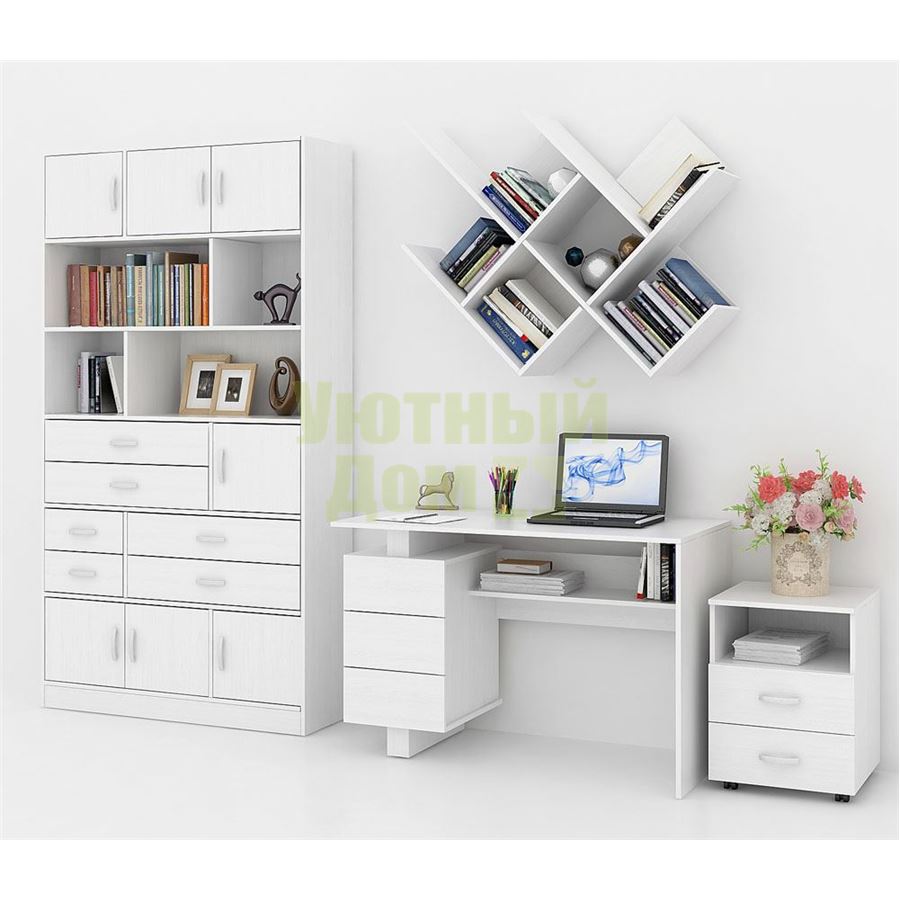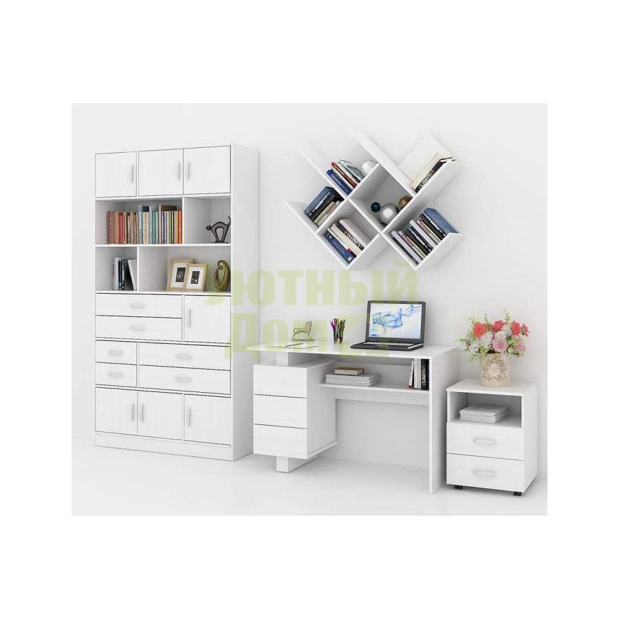 Каждый элемент возможно приобрести по отдельности. Состав комплекта: стол Ренцо-2 (1 шт.), стеллаж Либерти-6 (1 шт.), блок ящиков Либерти малый (1 шт.), блок ящиков Либерти большой (2 шт.), дверка для стеллажей Либерти (7 шт.), полка Файн-17 (2 шт.), тумба Альба-2 (1 шт.).