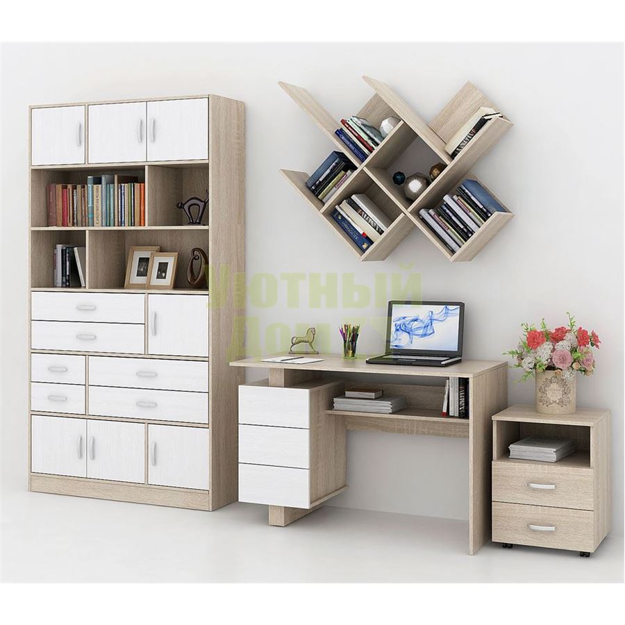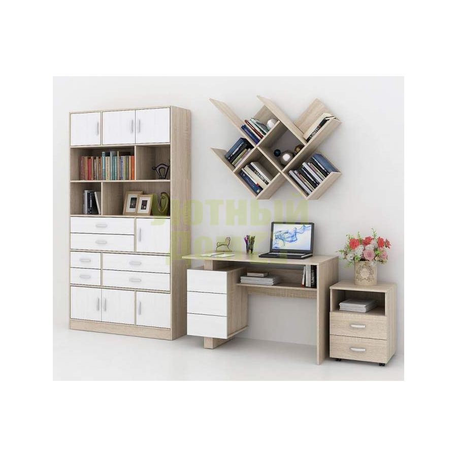 Каждый элемент возможно приобрести по отдельности. Состав комплекта: стол Ренцо-2 (1 шт.), стеллаж Либерти-6 (1 шт.), блок ящиков Либерти малый (1 шт.), блок ящиков Либерти большой (2 шт.), дверка для стеллажей Либерти (7 шт.), полка Файн-17 (2 шт.), тумба Альба-2 (1 шт.).