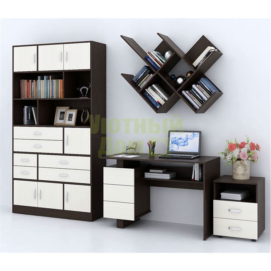 Каждый элемент возможно приобрести по отдельности. Состав комплекта: стол Ренцо-2 (1 шт.), стеллаж Либерти-6 (1 шт.), блок ящиков Либерти малый (1 шт.), блок ящиков Либерти большой (2 шт.), дверка для стеллажей Либерти (7 шт.), полка Файн-17 (2 шт.), тумба Альба-2 (1 шт.).