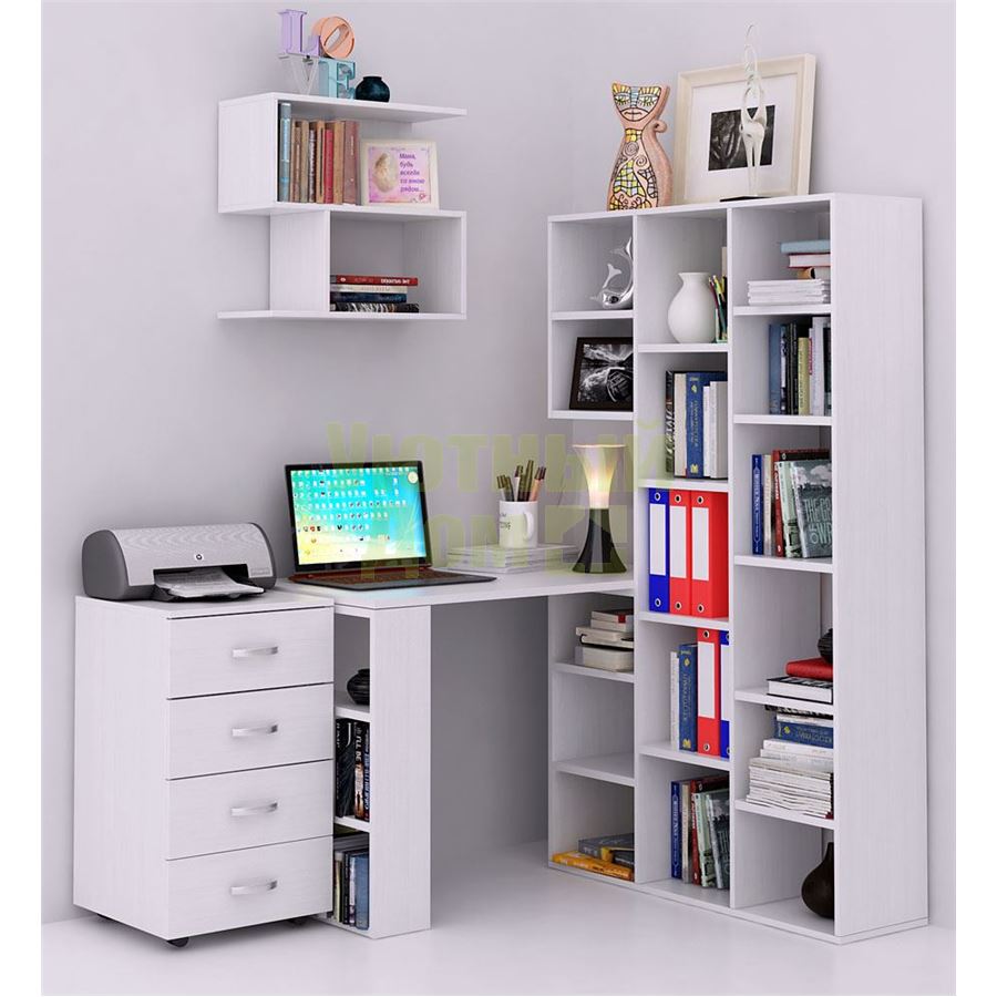 Каждый элемент возможно приобрести по отдельности. Состав комплекта: стеллаж Рикс-1 (1 шт.), стол Рикс-5 (1 шт.), тумба Альба-7 (1 шт.), полка Файн-12 (1 шт.).