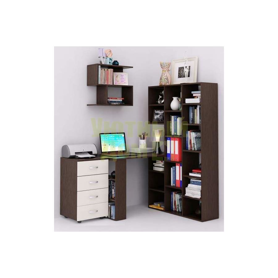 Каждый элемент возможно приобрести по отдельности. Состав комплекта: стеллаж Рикс-1 (1 шт.), стол Рикс-5 (1 шт.), тумба Альба-7 (1 шт.), полка Файн-12 (1 шт.).
