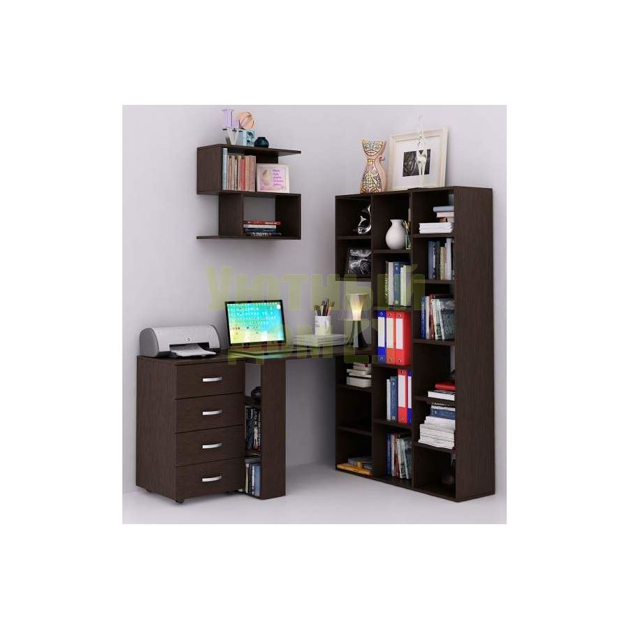 Каждый элемент возможно приобрести по отдельности. Состав комплекта: стеллаж Рикс-1 (1 шт.), стол Рикс-5 (1 шт.), тумба Альба-7 (1 шт.), полка Файн-12 (1 шт.).