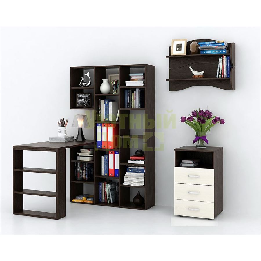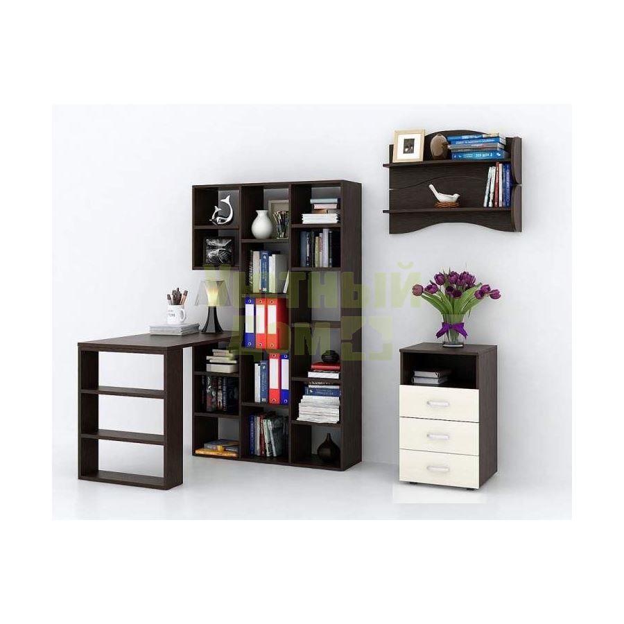 Каждый элемент возможно приобрести по отдельности. Состав комплекта: стеллаж Рикс-1 (1 шт.), стол Рикс-5 (1 шт.), тумба Альба-4 (1 шт.), полка Тэя-1 (2 шт.).