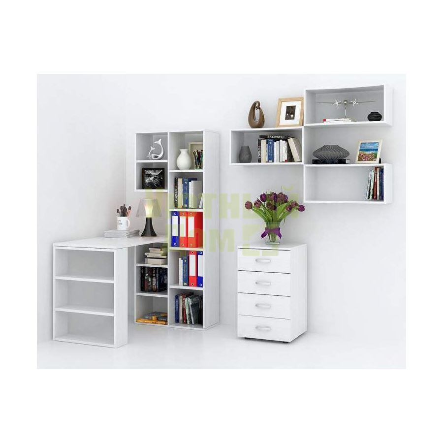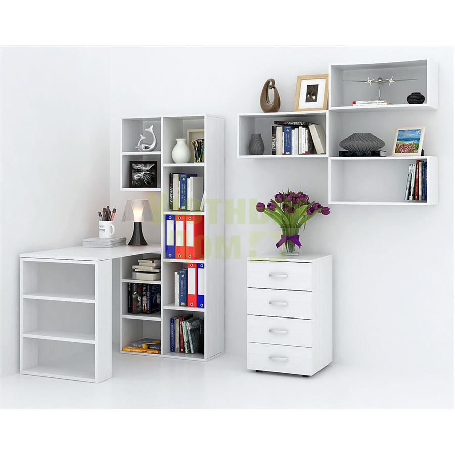 Каждый элемент возможно приобрести по отдельности. Состав комплекта: стеллаж Рикс-2 (1 шт.), стол Рикс-5 (1 шт.), полка Вэйв-7 (3 шт.), тумба Альба-7 (1 шт.).
