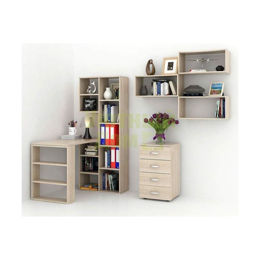 Каждый элемент возможно приобрести по отдельности. Состав комплекта: стеллаж Рикс-2 (1 шт.), стол Рикс-5 (1 шт.), полка Вэйв-7 (3 шт.), тумба Альба-7 (1 шт.).