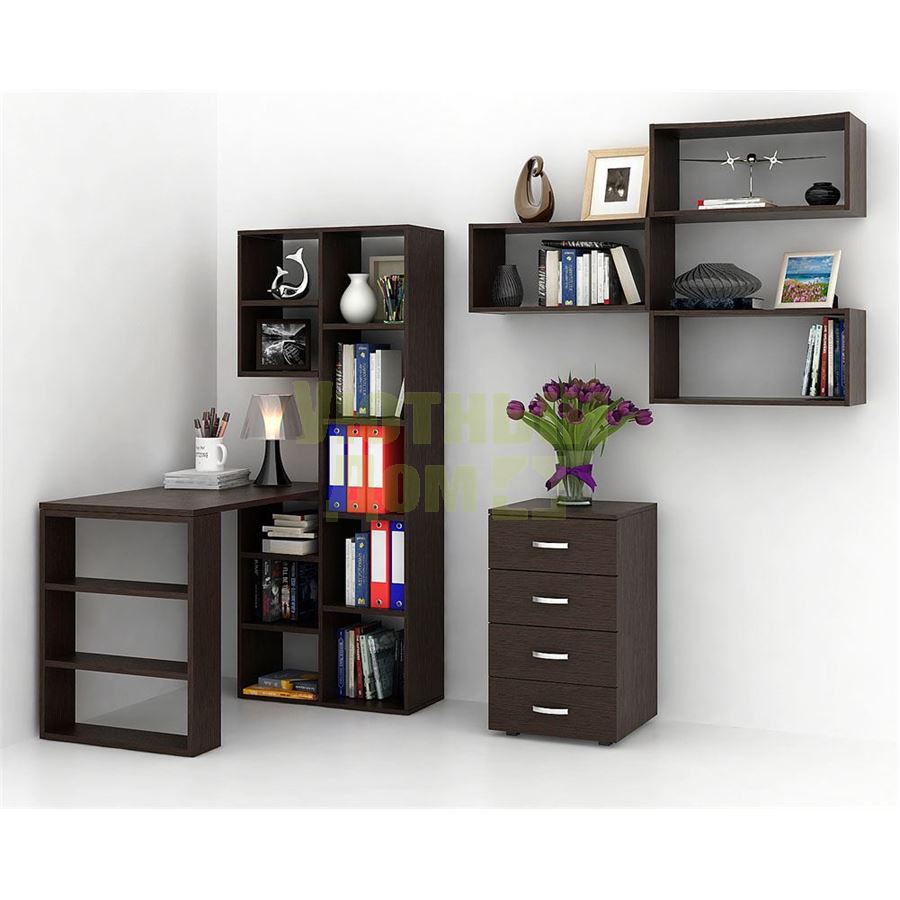Каждый элемент возможно приобрести по отдельности. Состав комплекта: стеллаж Рикс-2 (1 шт.), стол Рикс-5 (1 шт.), полка Вэйв-7 (3 шт.), тумба Альба-7 (1 шт.).