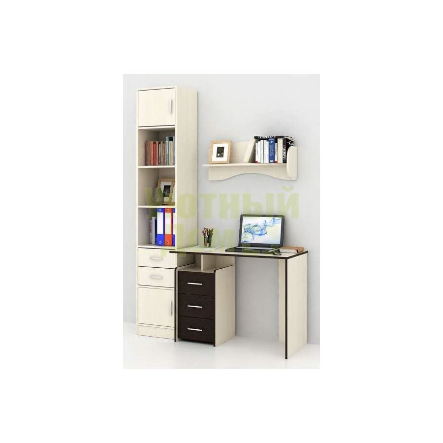 Каждый элемент возможно приобрести по отдельности. Состав комплекта: стол Слим-1 (1 шт.), стеллаж Либерти-4 (1 шт.), блок ящиков Либерти малый (1 шт.), дверка для стеллажей Либерти (2 шт.), полка Тэя-1 (2 шт.).