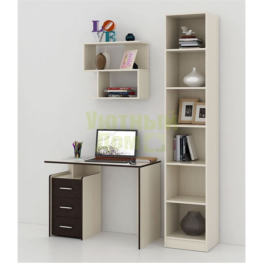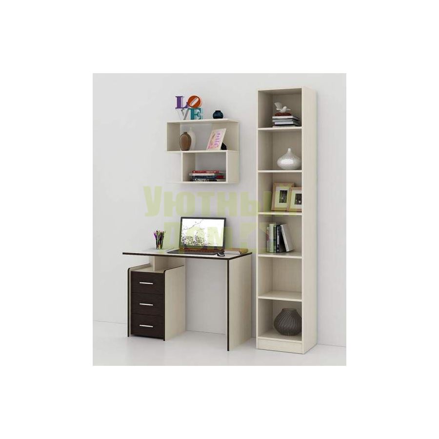 Каждый элемент возможно приобрести по отдельности. Состав комплекта: стол Слим-1 (1 шт.), стеллаж Либерти-4 (1 шт.), полка Файн-12 (1 шт.).