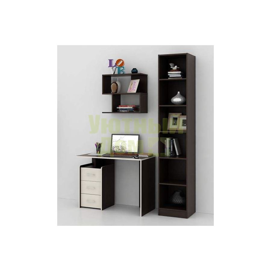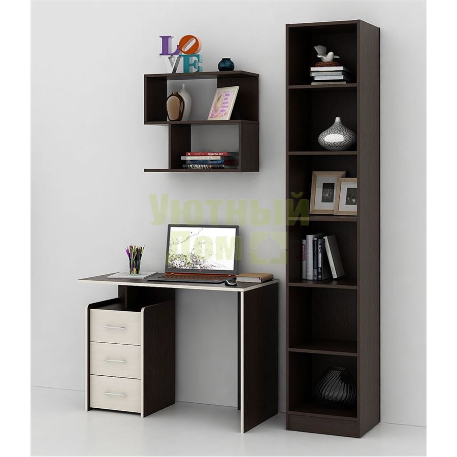 Каждый элемент возможно приобрести по отдельности. Состав комплекта: стол Слим-1 (1 шт.), стеллаж Либерти-4 (1 шт.), полка Файн-12 (1 шт.).