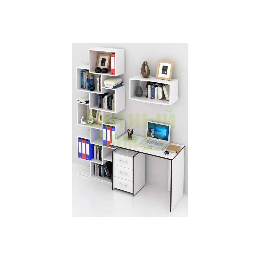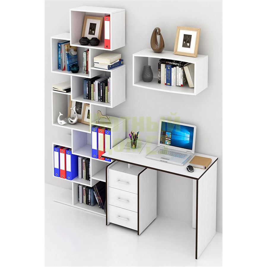 Каждый элемент возможно приобрести по отдельности. Состав комплекта: стол Слим-1 (1 шт.), стеллаж Зет-4 (1 шт.), полка Вэйв-7 (1 шт.).