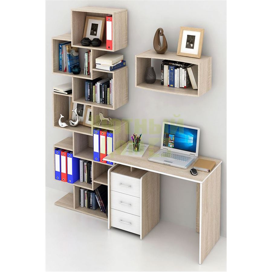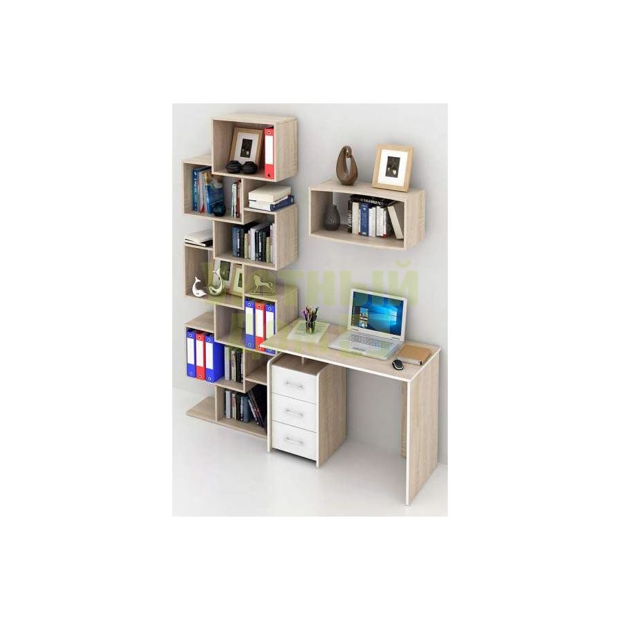 Каждый элемент возможно приобрести по отдельности. Состав комплекта: стол Слим-1 (1 шт.), стеллаж Зет-4 (1 шт.), полка Вэйв-7 (1 шт.).