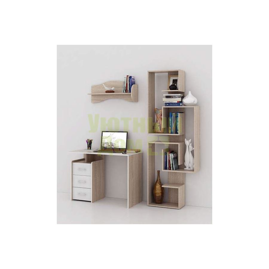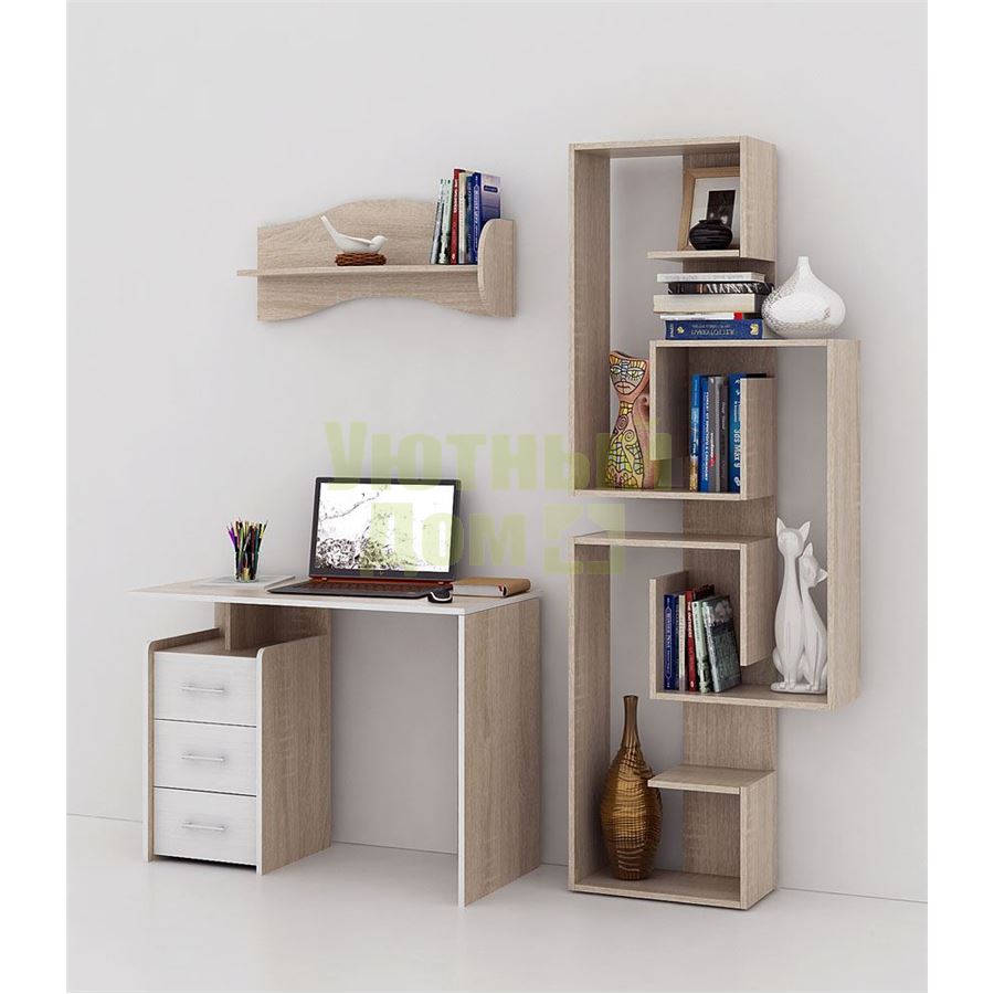 Каждый элемент возможно приобрести по отдельности. Состав комплекта: стол Слим-1 (1 шт.), стеллаж Зет-5 (1 шт.), полка Тэя-1 (1 шт.).