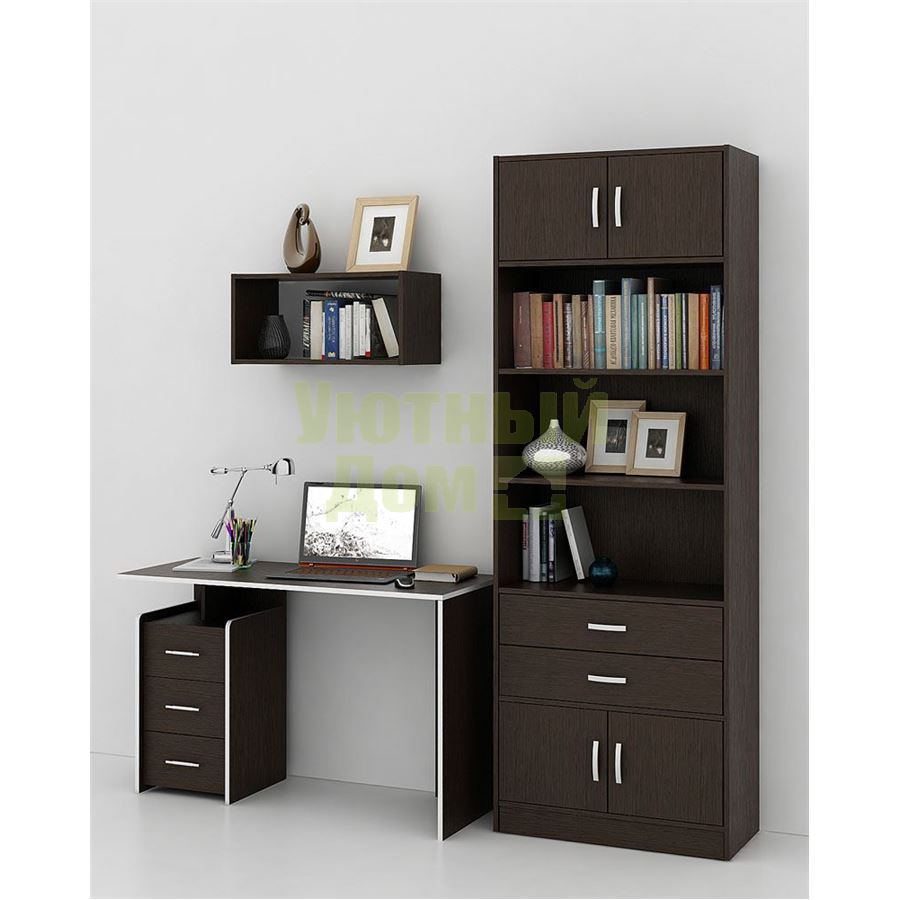Каждый элемент возможно приобрести по отдельности. Состав комплекта: стол Слим-2 (1 шт.), стеллаж Либерти-5 (1 шт.), блок ящиков Либерти большой (1 шт.), дверка для стеллажей Либерти (4 шт.), полка Вэйв-7 (1 шт.).