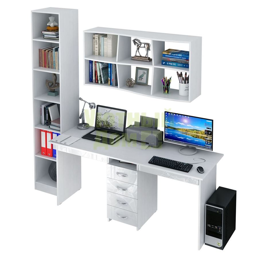 Сборку данного товара желательно осуществлять вдвоем во избежание травмоопасных си...читать ещеКаждый элемент возможно приобрести по отдельности. Состав комплекта: стол Тандем-2Я Глянец (1 шт.), полка Вэйв-9 (1 шт.), стеллаж Либерти-4 (1 шт.).